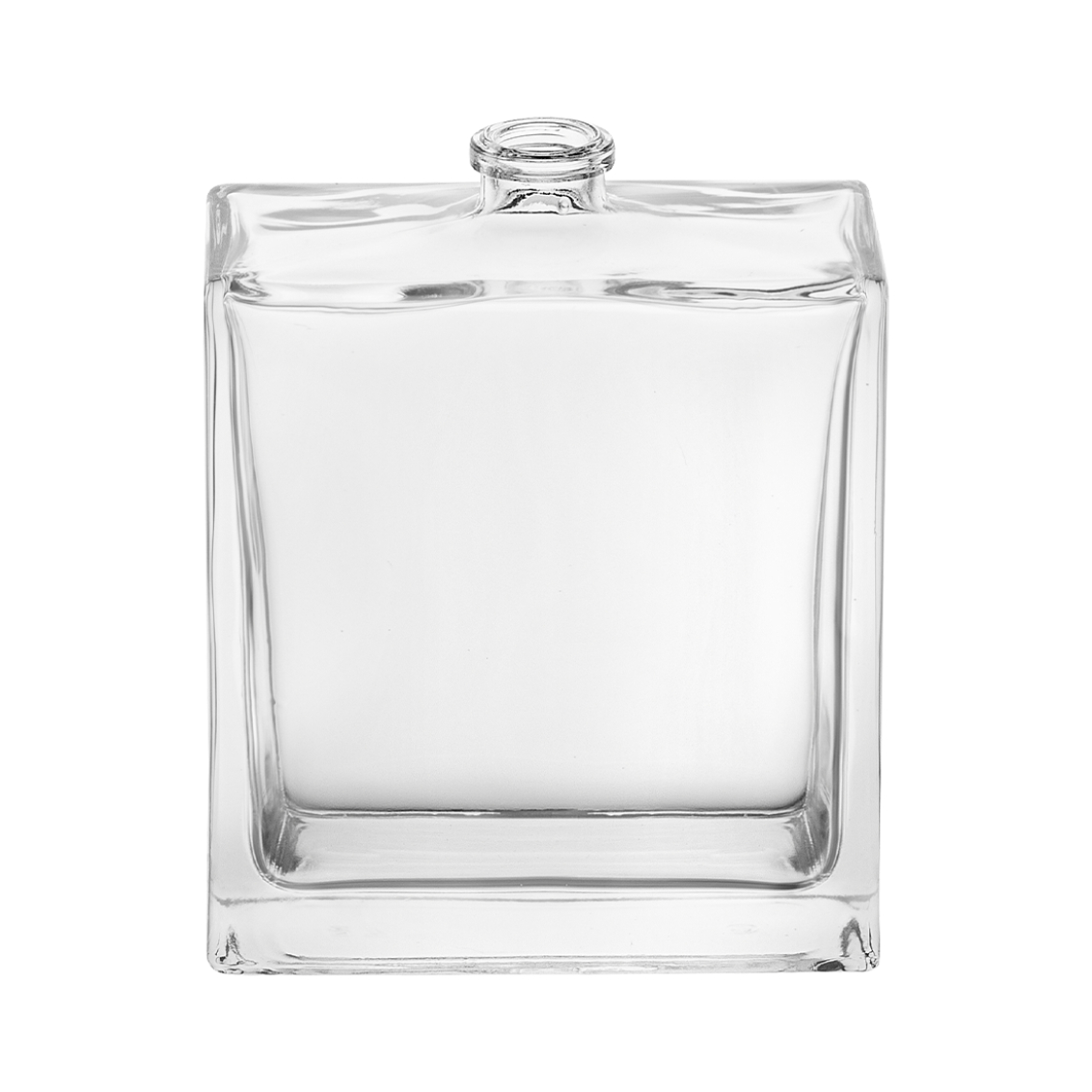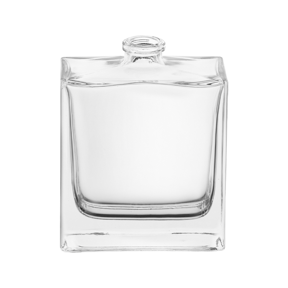 Frasco cuadrado compacto con proporciones equilibradas y base sólida, ideal para conceptos minimalistas.