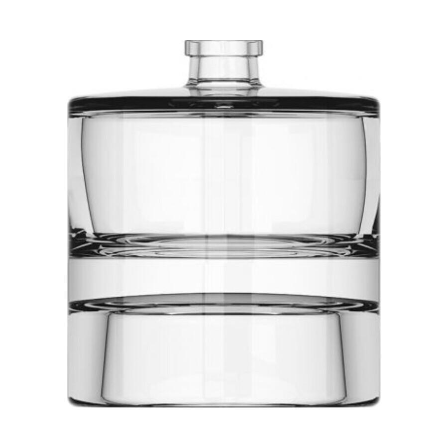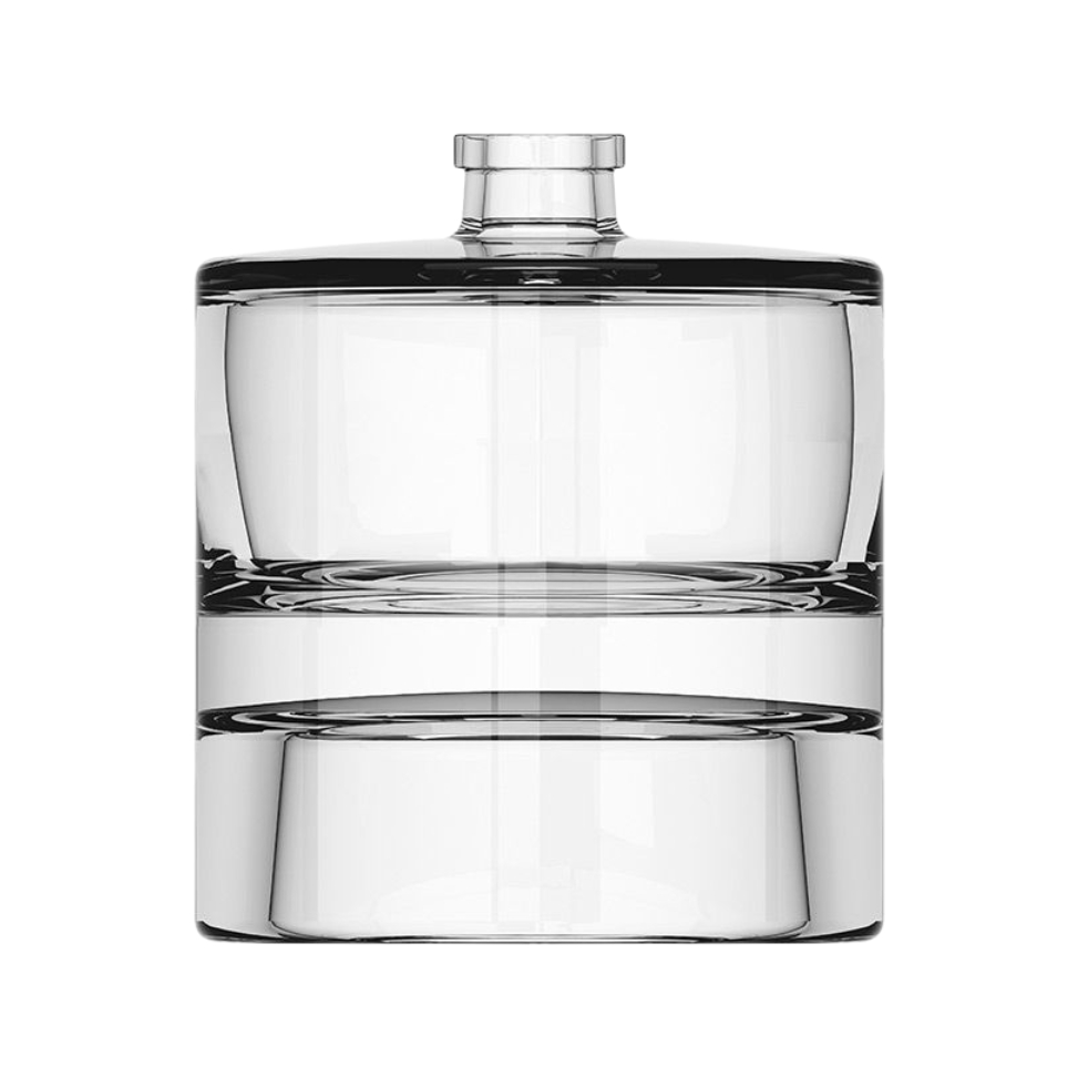 Frasco cilíndrico con arquitectura en doble volumen que aporta profundidad visual y carácter.